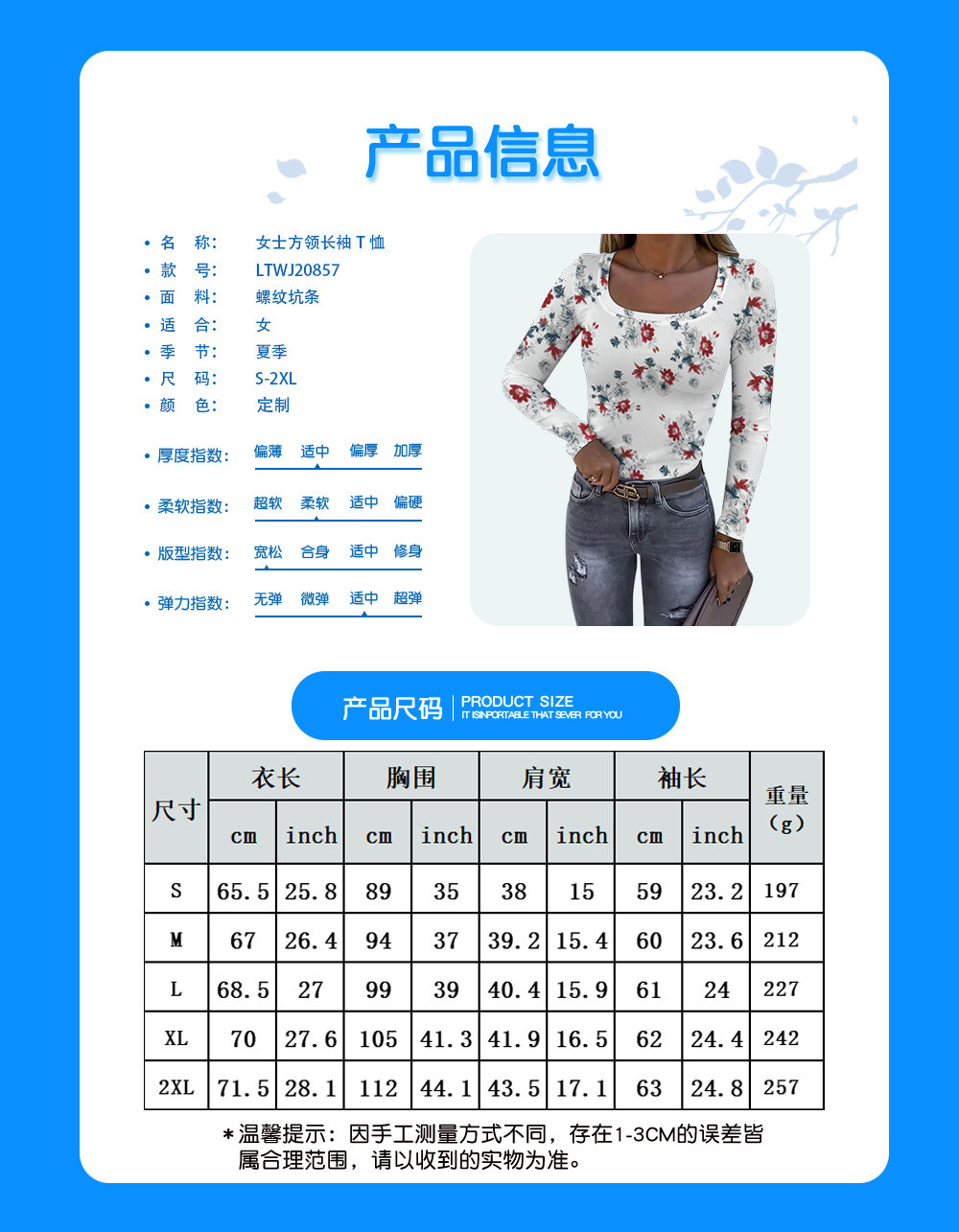 中文名称:女罗文方领长袖T恤英文名称:产品货号:LTWJ20857生产工艺: 满印印花产品材质:螺纹坑条