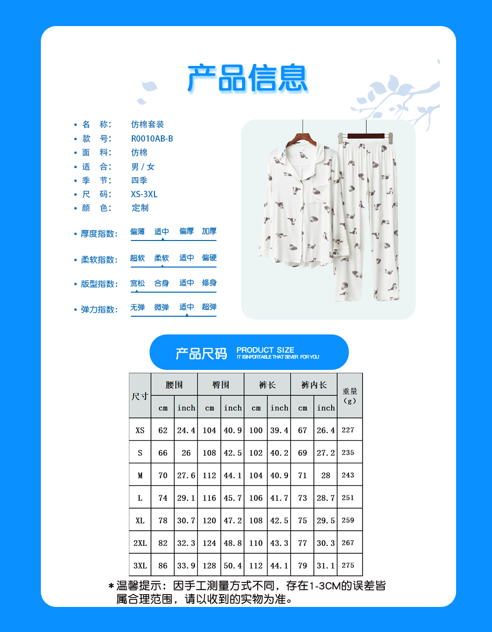 中文名称:仿棉套装-裤子英文名称:产品货号:R0010AB-B生产工艺: 满印印花产品材质: 仿棉