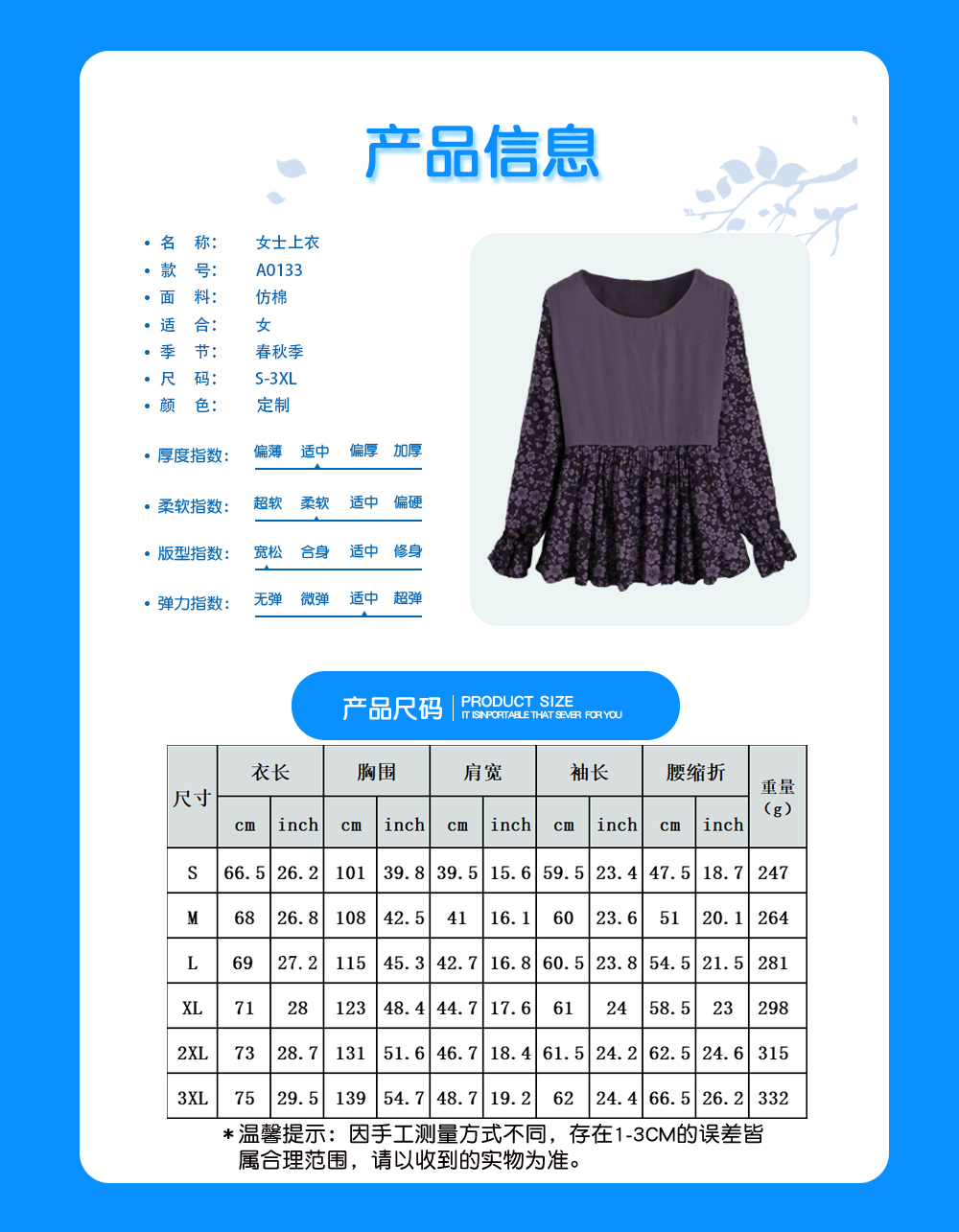 中文名称:女士上衣英文名称:产品货号:A0133生产工艺: 满印印花产品材质: 仿棉