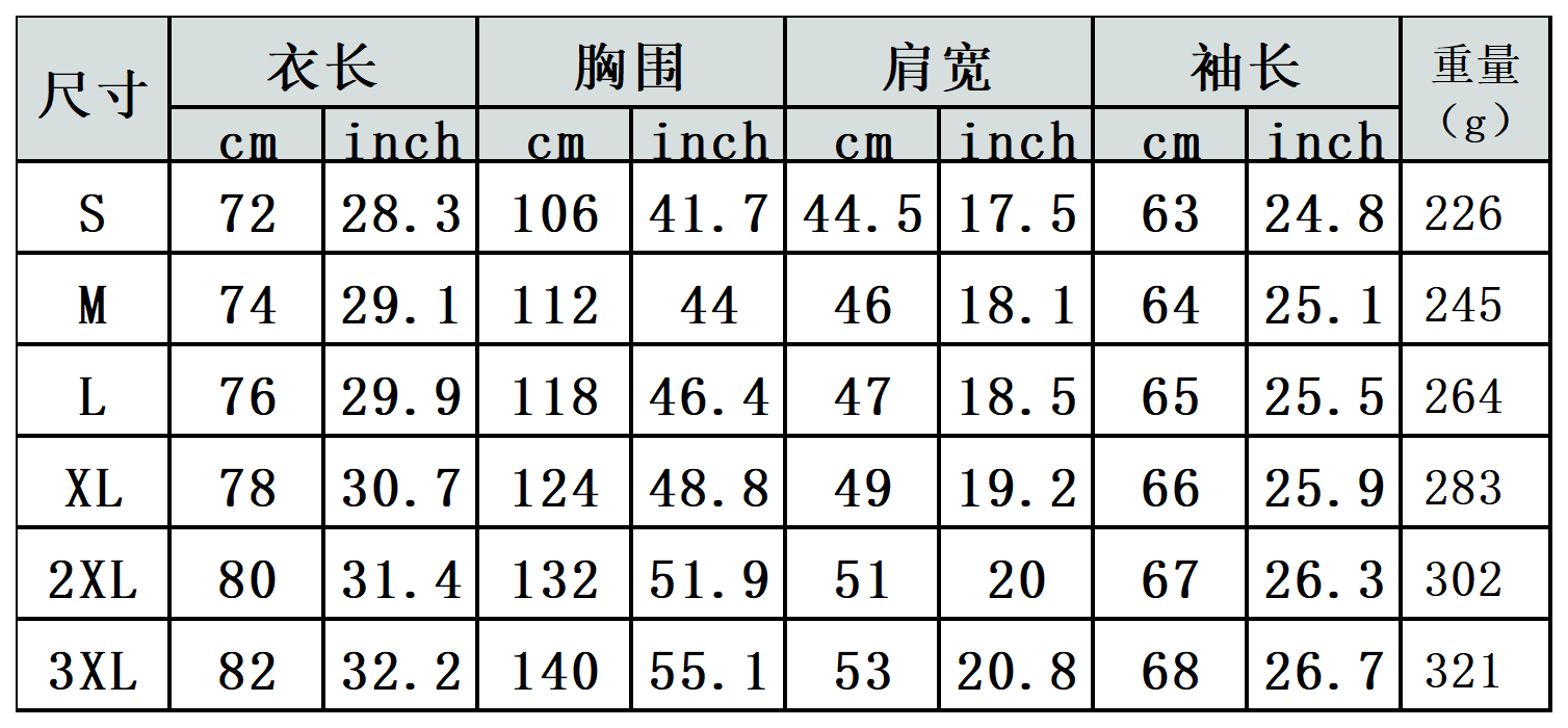 【特别说明】此尺码数据在衣服平铺下测量所得,因测量方法不同,误差在1-3cm内的属于正常现象
