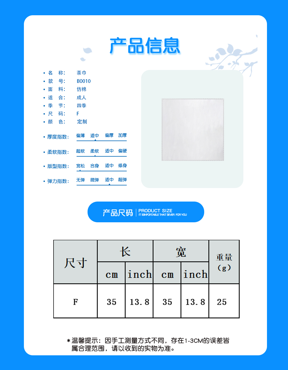 中文名称:茶巾35x35CM英文名称:产品货号:B0010生产工艺: 满印印花产品材质:仿棉