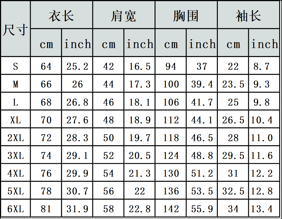 【特别说明】此尺码数据在衣服平铺下测量所得,因测量方法不同,误差在1-3cm内的属于正常现象
