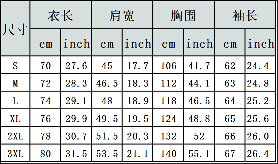 【特别说明】此尺码数据在衣服平铺下测量所得,因测量方法不同,误差在1-3cm内的属于正常现象