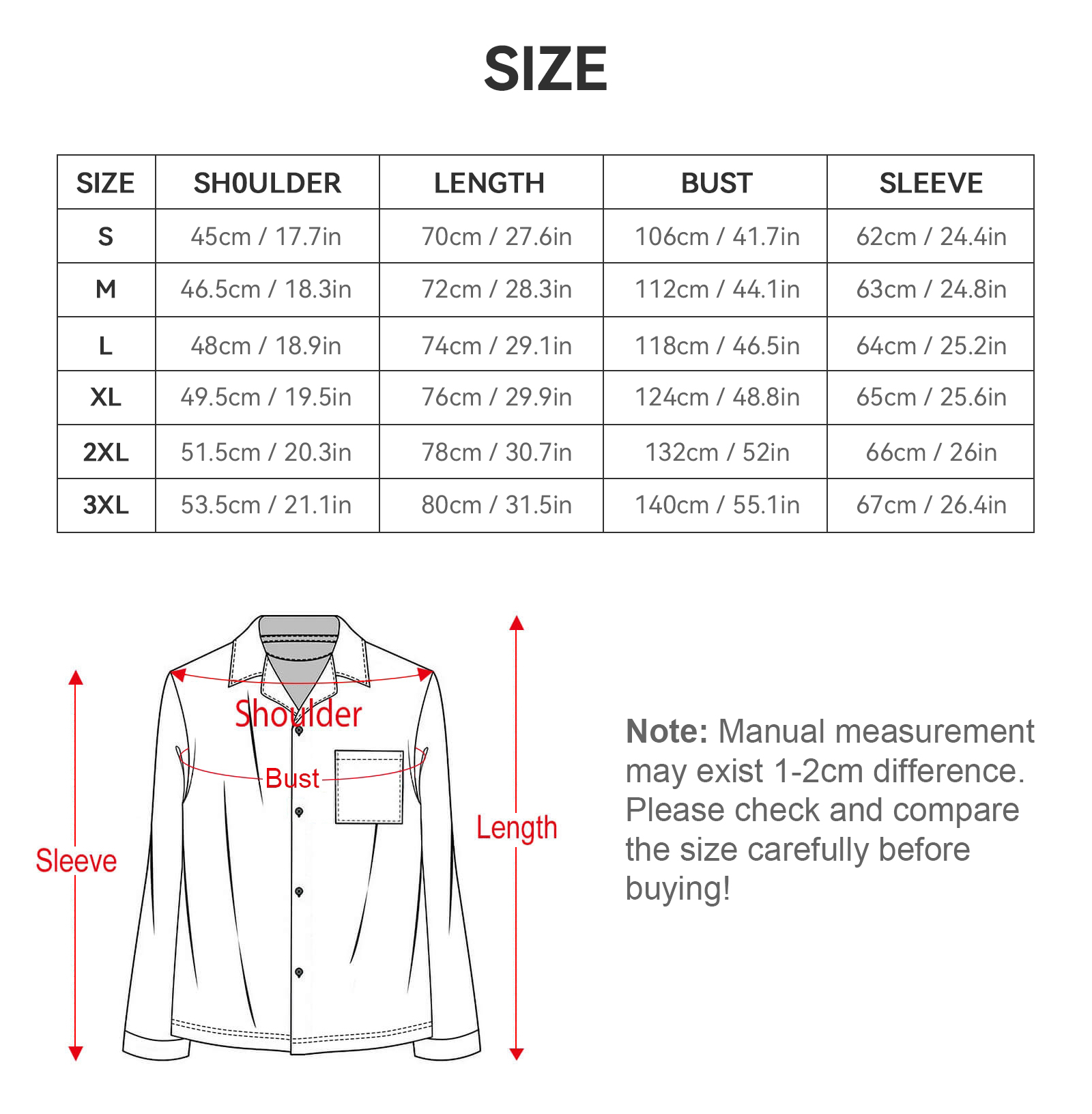 【特别说明】此尺码数据在衣服平铺下测量所得,因测量方法不同,误差在1-3cm内的属于正常现象