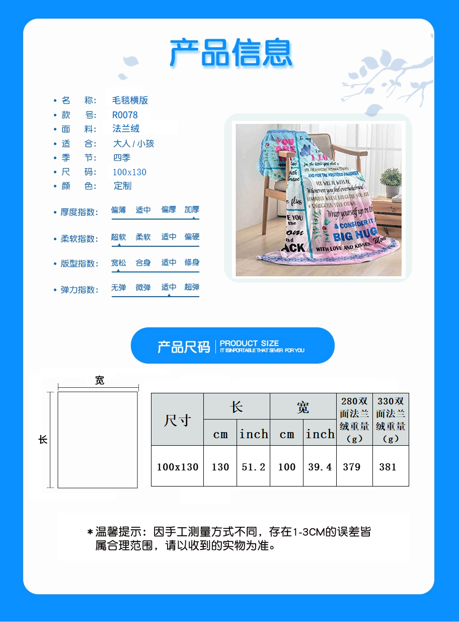 中文名称: 3D 毛毯竖版法兰绒100X130cm英文名称: blanket产品编号:R0078生产工艺: 满印印花产品材质:法兰绒