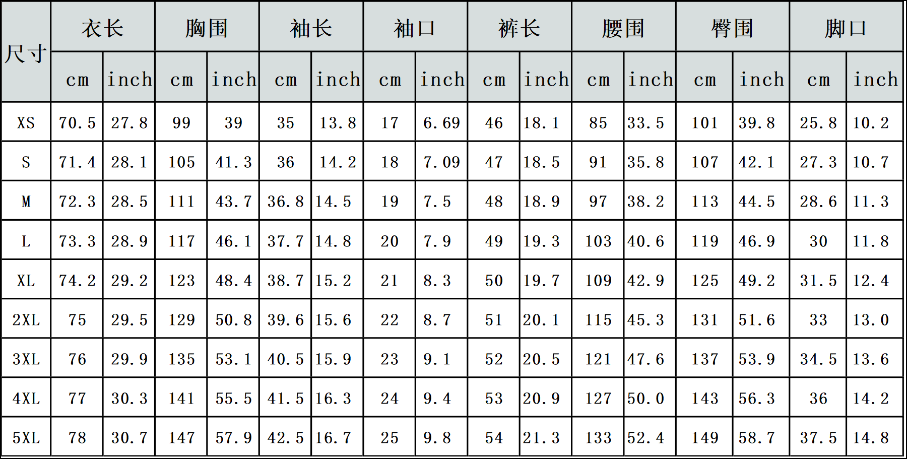 【特别说明】 此尺码数据在衣服平铺下测量所得,因测量方法不同,误差在1-3cm内的属于正常现象