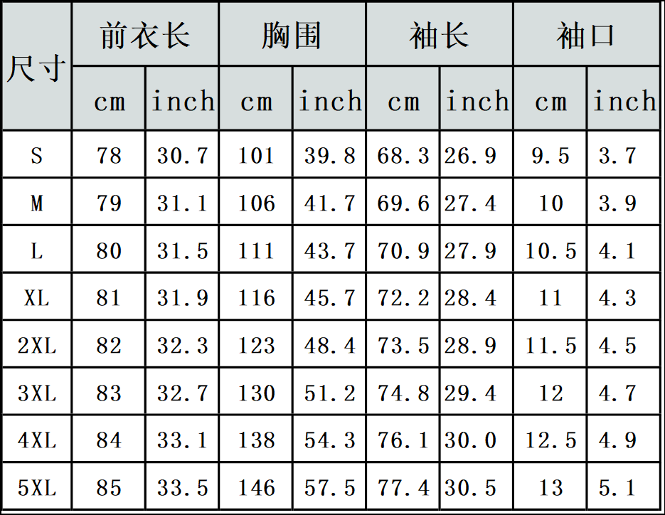 【特别说明】此尺码数据在衣服平铺下测量所得,因测量方法不同,误差在1-3cm内的属于正常现象