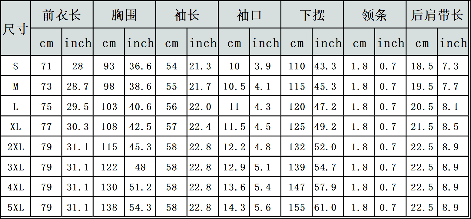【特别说明】此尺码数据在衣服平铺下测量所得,因测量方法不同,误差在1-3cm内的属于正常现象。