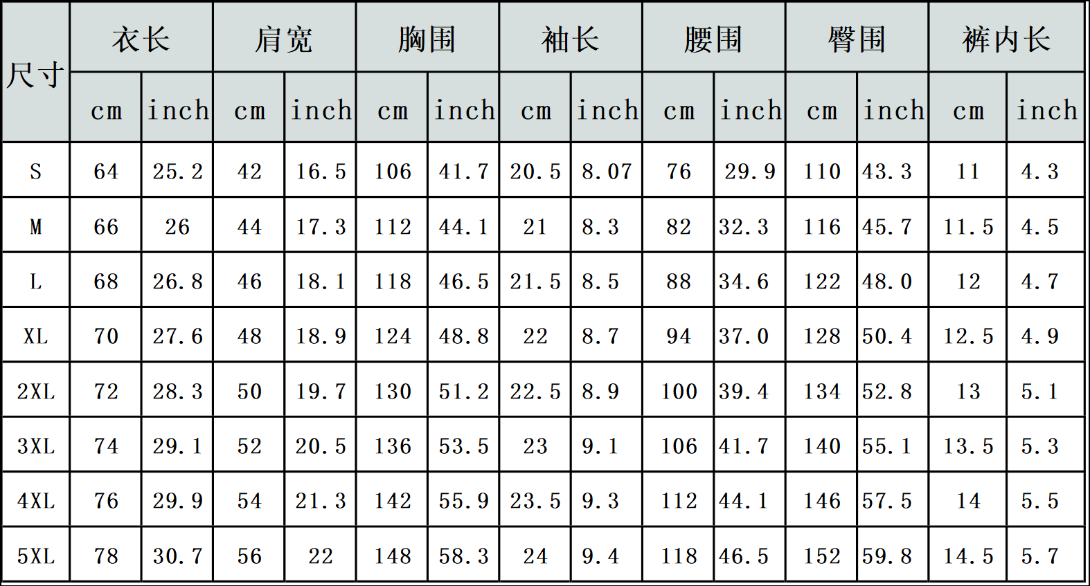 【特别说明】此尺码数据在衣服平铺下测量所得,因测量方法不同,误差在1-3cm内的属于正常现象